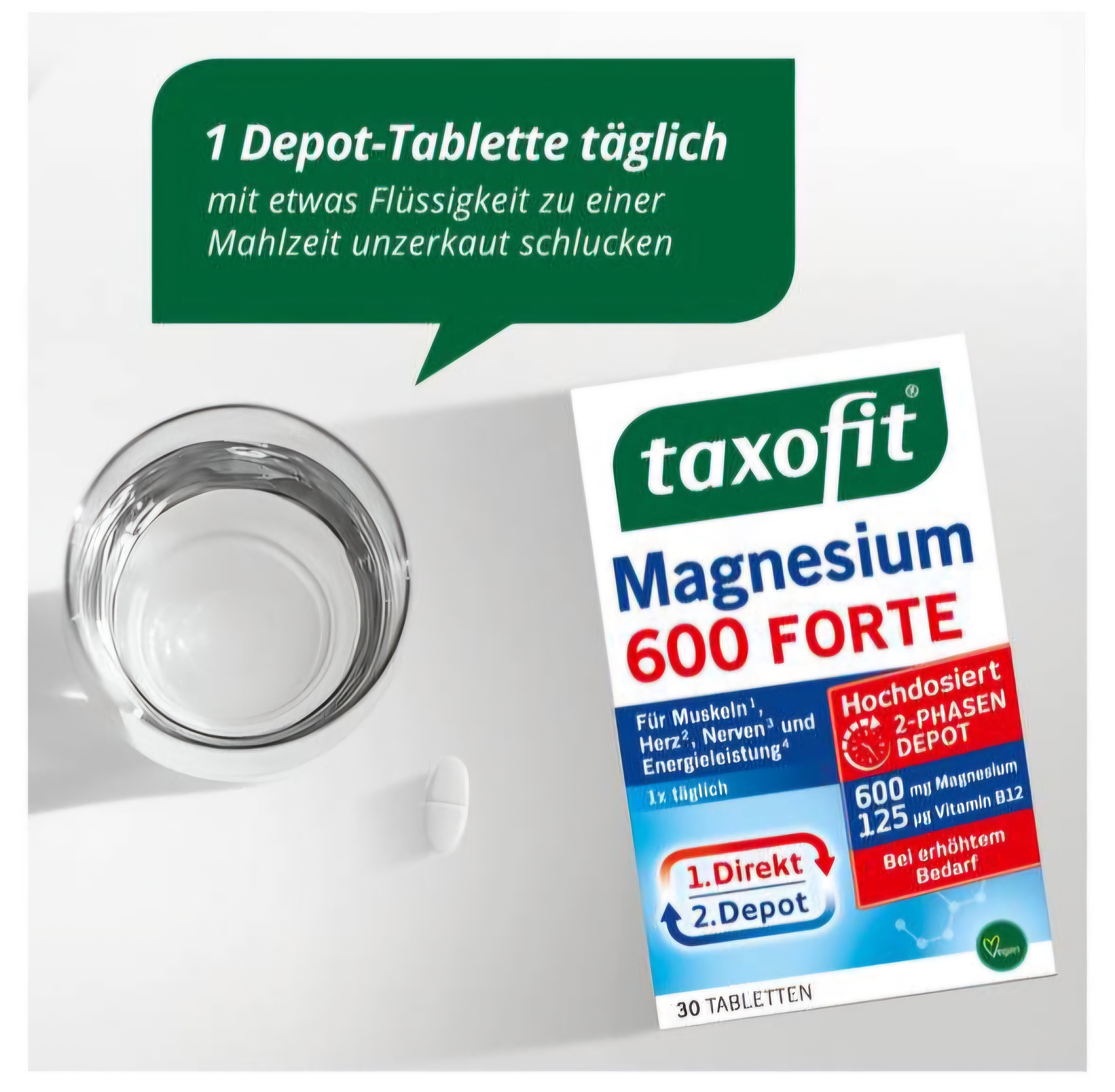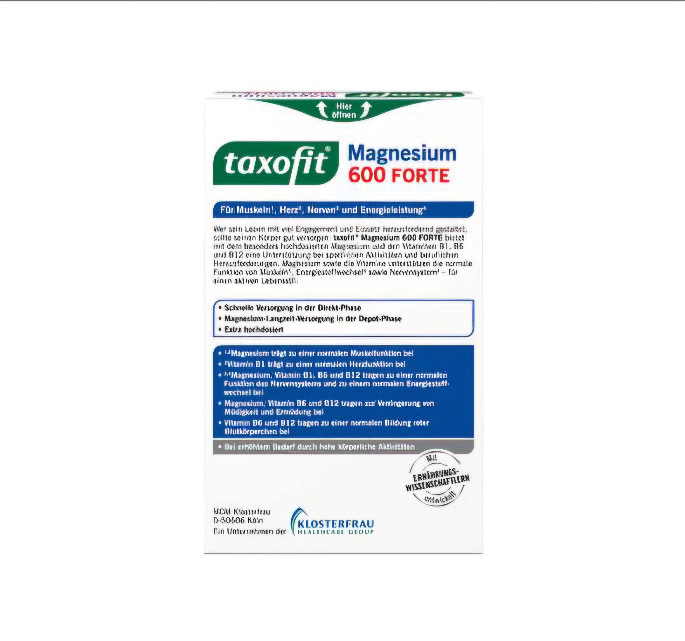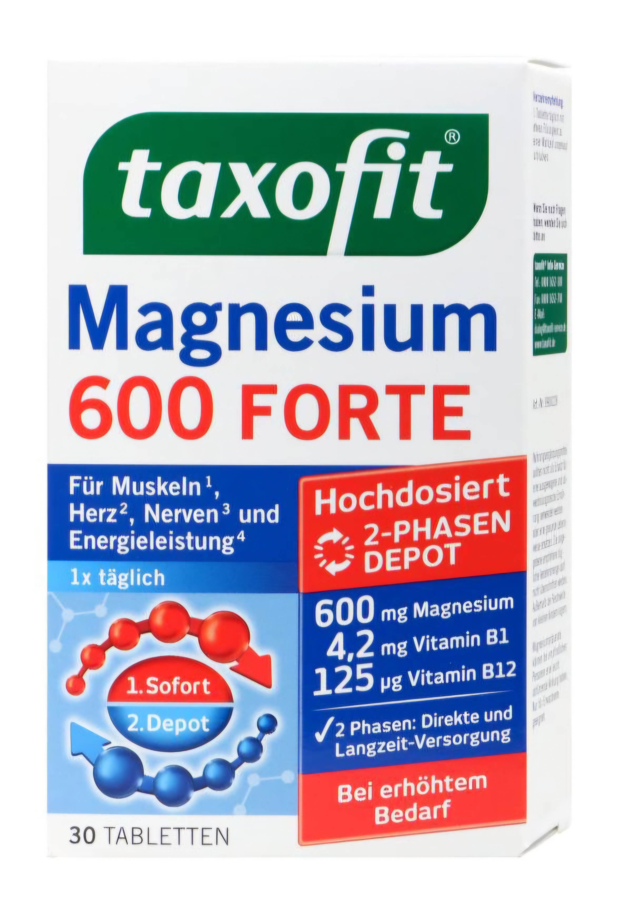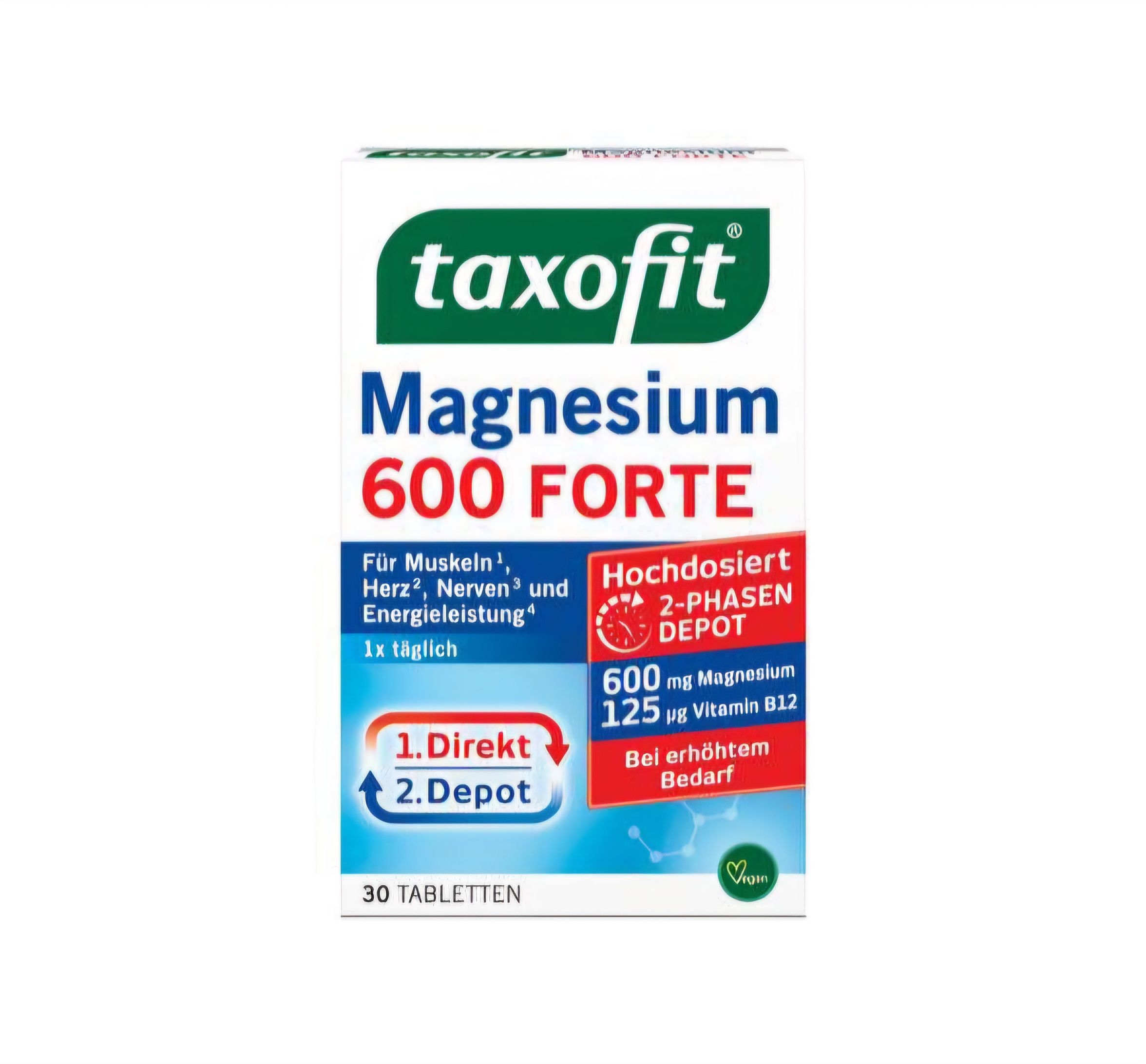 این محصول Taxofit Magnesium 600 FORTE یک مکمل غذایی آلمانی است که حاوی دوز بالای منیزیم و ویتامین B12 است و برای تأمین نیاز روزانه بدن در شرایط افزایش نیاز طراحی شده است.
