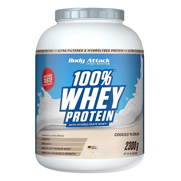 پروتئین وی بادی اتک 2.3 کیلوگرم BODY ATTACK 100% WHEY PROTEIN محصولی بهینه برای حفظ توده عضلانی و ساخت عضلات جدید است. این محصول منحصر به فرد برای ورزشکاران آماتور و حرفه ای مناسب می باشد.تقریبا 24 گرم پروتئین از پروتئین های وی، تنها 2.3 گرم کربوهیدرات و تقریبا 1.5 گرم چربی در هر وعده ارائه می شود. علاوه بر این، پودر پروتئین وی بادی اتک حاوی BCAA است که برای ورزشکاران بسیار مهم است.