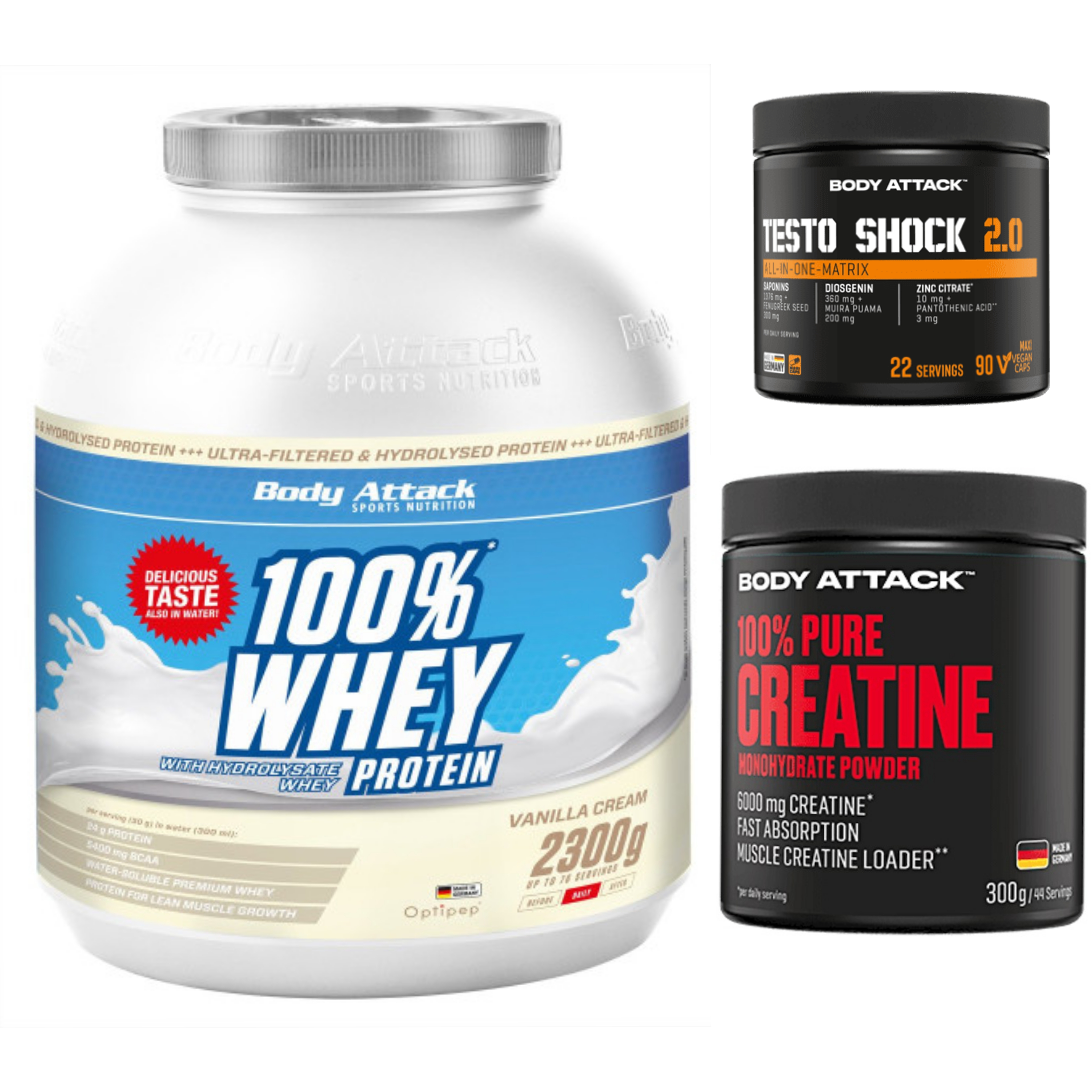 پروتئین وی خالص و فوق العاده بادی اتک به همراه کراتین منوهیدرات این برند که از معدود کراتینهای دنیا با دوز ۶۰۰۰ میلیگرم میباشد در کنار مکمل تستو شوک که باعث افزایش ترشح طبیعی تستسترون در بدن میشود، یک نتیجه فوق العاده را برای شما تضمین میکند.