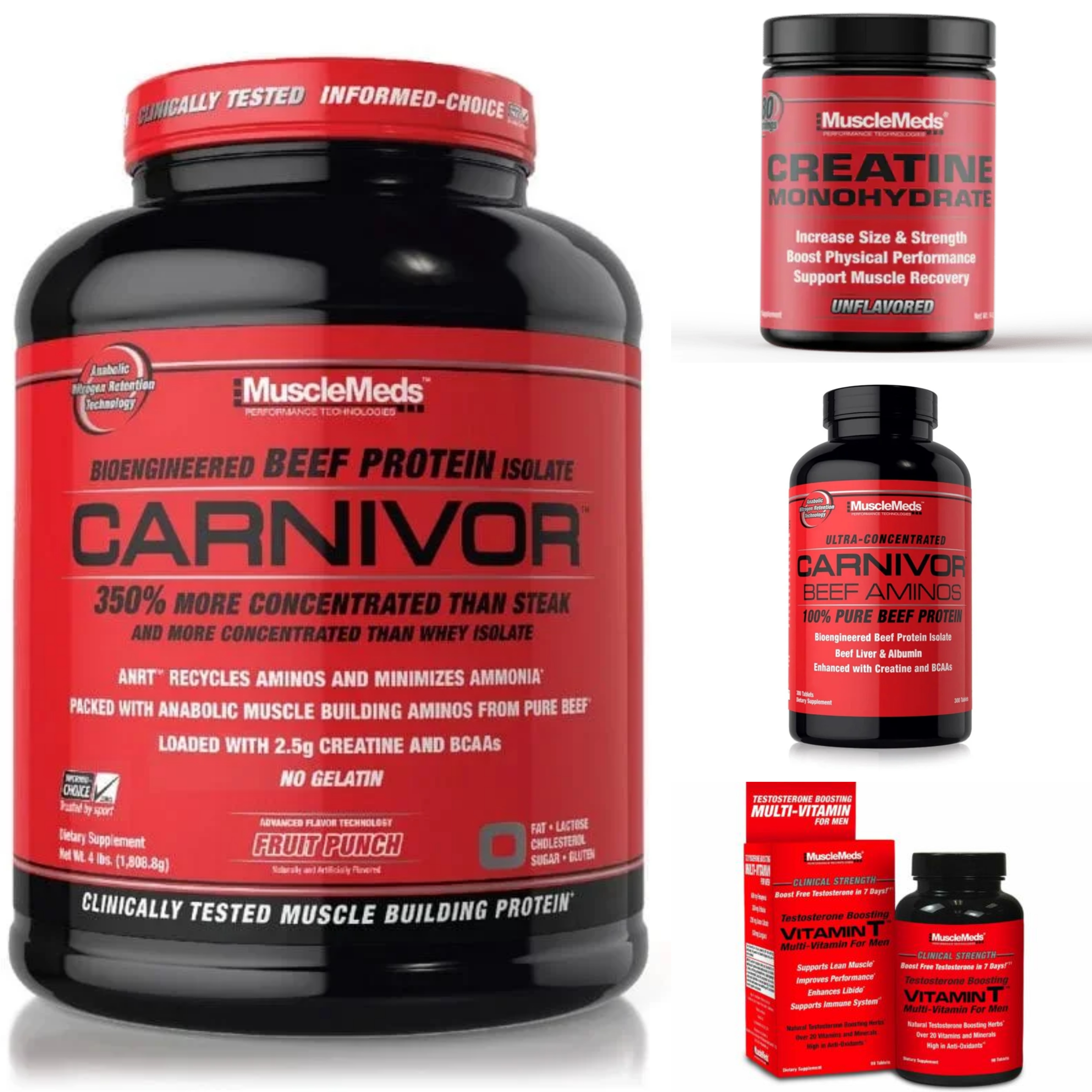 پکیج افزایش حجم ماسل مدز (MuscleMeds) یک مجموعه حرفهای و تهاجمی است که با تمرکز بر پروتئین گوشت گاو خالص (Carnivor) و حمایت از تولید طبیعی تستوسترون طراحی شده است. این پکیج برای ورزشکارانی که به دنبال افزایش حجم عضلانی با کیفیت، حداکثر قدرت و بهینهسازی محیط هورمونی برای رشد هستند، انتخابی بینظیر است.